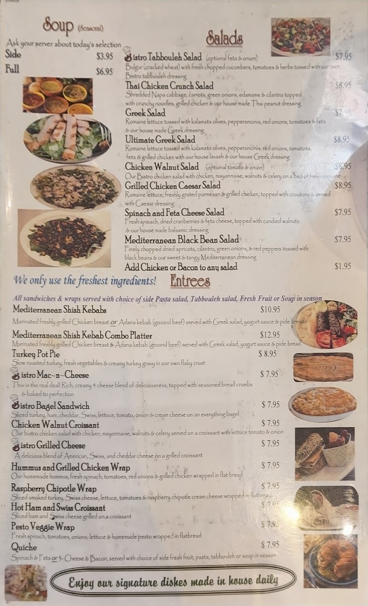 Drinks range from classic iced teas and cappuccinos to unique choices like caramel hazelnut lattes and vanilla Italian cream sodas, complementing both the baked goods and savory plates. Breakfast offerings like the egg scramble or bistro breakfast sandwich invite easy mornings, while options like the ultimate Greek salad or combo kabobs are well-suited for satisfying, relaxed afternoons or early evenings.